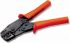 besonders geeignet für ausgedünnte, feindrähtige Leiter nach IEC 228. Einhand-Systempresszange. Hebelübesetzte Presszange mit Ratschenmechankik und Druckpunktentriegelung mit einer Vielzahl auswechselbarer, durch zwei Befestigungsschrauben fixierter Pressprofileinsätze. Die ergonomisch geformte Crimpzange ist leicht und handliche zu bedienen. Über die Hebelwirkung des Griffs wird die integrierte Ratschenautomatik ausgelöst. Regulierbare Zwangsentriegelung gewährleistet optimale Crimpergebnisse. Alle Einsätze werden aus Carbon-Werkzeugstahl angefertigt. Die 17 verschiedenen Profile eignen sich nahezu allen Verpressungen von Kabelverbindern. Länge 230 mm