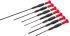 Präzisions-Schraubendreher-Sortiment, 7-teilig. Die optimalen Werkzeuge speziell für kleinste Schrauben bei elektronischen und elektrischen Bauteilen, Radio- und Stereoanlagen, Telefonanlagen und allen Kommunikationsanschlüssen, für Feinmechanik, Elektronik, Modellbau und ähnliche fein-sensorische Arbeiten. Klingen aus Spezialstahl, Farbcodierungsring zur Kennzeichnung des Schraubsystems. Für Schlitzschrauben: 1,0x0,18x40 mm