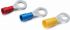 Isolierte Quetschkabelschuhe, Ringform Cu, isoliert, DIN 46237 von 0,5 - 6 mm². Technische Daten - Werkstoff: Cu-ETP nach DIN EN 13600 - Oberfläche: galvanisch verzinnt - Für zugentlastete Verbindungen - Isolation PA (Polyamid, Nylon), halogenfrei - Temperaturbeständigkeit -60°C bis +105°C - Easy Entry ermöglicht einfaches und schnelles Einführen des Leiters, 600 V max. Ausführung: Querschnitt: 1,5-2,5 mm², Bolzen mit einem Ø von 3 mm, Nenngröße nach DIN: 3-2,5, Isolationsfarbe: blau, D1: 2,3, D2: 4,5, D3: 3,2, A1: 11,5, B 6, L 17, Gewicht per 100 St.~: 0,08 kg, nach DIN: x, UL gelistet: x, VE/Stck.: 100.