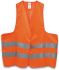 Warnweste als Pannenweste für Kfz-Fahrer und für den Einsatz im Straßendienst, in leucht-orange (RAL 2005) aus Baumwoll-Mischgewebe (80% Polyester, 20% Baumwolle), mit zwei rundum horizontal verlaufenden, 50mm breiten Reflektorstreifen für beste Erkennbarkeit, Einheitsgröße, universelle Größenverstellbarkeit durch Klett-Schnellverschluss, gemäß EN 471.