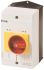 Isolierstoffgehäuse für PKZM0 +Drehgriff, rot/gelb, Schutzart IP65, glasfaserverstärktes Polycarbonat, Gehäuseunterteil RAL 9005, schwarz/Gehäuseoberteil RAL 7035, hellgrau, Metrische Vorprägungen oben, unten und in der Rückplatte, in der Rückwand,Leitungsdurchsteckmembran, Steuerleitungseinführung