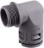 Kunststoff Schnellverschraubung Winkel 90° RQW1-M, IP 66 einteilig, metrisches Außengewinde, konisch dichtend, für ROHRflex Wellschläuche Material: Kunststoff (PA), Farbe: grau (auch in schwarz lieferbar) Temperaturbereich: -40°C ...+120°C Zulassungen: VDE geprüft EN/IEC 61386-23 / UL 1696 CSA 22.2 UR-File-no E86359 / NFPA 130 - ASTM E 162-E 662 SMP 800-C / Lloyds Register of Shipping / Gost, Eigenschaften: beständig gegen Öl und Benzin / silkon-, cadmium und halogenfrei / weitgehend säure- und lösungsmittelbeständig