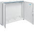 Feldvert. AP, univers, IP44, SKII, 144PLE, 3x4 Reihen 650x800x161mm, leer m. Tür.Feldverteiler nach DIN EN 61 439-1/-3, Maßnorm nach DIN 43 870. Zum Einbau für Geräte bis 125 A, Luft- und Kriechstrecken nach DIN EN 60664-1. Bestehend aus Schrank mit Tür aus pulverbeschichtetem und eingebranntem Stahlblech. Ab Schrankbreite 800 mm (3-feldig) zwei türiger Aufbau. Rechte Türen maximal 2-feldig breit. Leerschrank ohne Einbausatz. Leitungseinführungen oben/unten durch herausnehmbare flexiblen Kunststoffflanschplatten, zusätzlich austauschbar. Tür mit innenliegenden justierbaren Scharnieren und einem Öffnungswinkel von 110°. Türen rechts und links anschlagbar, werkzeugloser wechselbar Türanschlag. Türverschluss serienmäßig mit Dreipunkt-Stangenverschluss und plombierbaren Klappgriff. Austauschbare sperrbare Schließsysteme und Türen, siehe Zubehör.