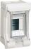 Kleinverteiler, vector, APV, IP65, 3PLE, mit Einführungstüllen.Installationskleinverteiler AP aus Kunststoff, nach DIN EN 60670-24, nach DIN 43871. Zum Einbau von Geräten bis 63 A nach Maßnorm DIN 43 880 mit 70 mm oder 85 mm Einbautiefe, Bemessungsspannung AC 400 V/50 Hz. Bestehend aus Kunststoffunterteil mit Hutprofilschiene aus verzinktem Stahlblech, Vorprägung für metrische Leitungseinführungstüllen (oben, unten), seitliche Vorprägungen für Verbindungstüllen zur Verbindung von zwei oder mehreren Verteilern nebeneinander. Eingebaute PE/N-Klemmen Schnellsteckklemme, Oberteil mit 46 mm Geräteschlitz. Klarsichttür frontbündig, rechts oder links anschlagbar, plombierbar, abschließbar, Verteiler anflanschbar.