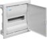 Bestehend aus: Kunststoff-Mauerkasten mit serienmäßigem Leitungsabfang und ausbrechbaren Leitungseinführungsschiebern mit Schnappbefestigung, integrierter Wasserwaage und verzinkten Stahlblech-Befestigungslaschen. Geräteträger aus verzinktem Stahlblech, Hutschienen einzeln isoliert einbaubar. Geräteabdeckung aus Kunststoff mit 46 mm Geräteschlitz, Schnellverschlussbefestigung mit 90° Drehung, serienmäßig plombierbar. Verdrehbarer Blendrahmen mit Tür aus Stahlblech, pulverbeschichtet und eingebrannt, mit 15 mm Putzausgleich. Tür, frontbündig mit innenliegenden handbedienbaren Scharnieren. Türverschluss mit frontbündiger Griffmulde und selbsttätig zurückklappendem Griff, Türanschlag rechts oder links ohne Blendrahmendemontage. Fingersichere PE/N-Klemme mit Stecktechnik in montagefreundlicher Schnapptechnik und N-Klemme für FI-Kreise serienmäßig.