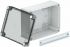 Kabelabzweigkasten geschlossen zum Verbinden von Kabeln und Leitungen im Innenbereich und geschützten Außenbereichen. Rechteckige Form ohne Einführungen. Geeignet für die Wand-/ Deckenmontage, die Montage auf Montageblechen und Gewinde im Boden. Mit der Möglichkeit zur Innenbefestigung und Montage über die Eckdome. Hoher, transparenter Deckel mit Schnellverschluss, plombierbar. Hergestellt aus halogenfreien und UV-resistenten Materialien. Inklusive Hutprofilschiene. Kabelabzweigkasten gemäß DIN EN 60670. Flammwidrig nach DIN EN 60695-2-11, Prüftemperatur 650°C. Schlagfestigkeit IK05 gemäß DIN EN 50102.