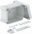 Kabelabzweigkasten mit Hutprofilschiene zum Verbinden von Kabeln und Leitungen im Innen- und Außenbereich. Rechteckige Form ohne Einführungen. Geeignet für die Wand-/ Deckenmontage mit der Möglichkeit zur Außenbefestigung, Innenbefestigung oder Montage über die Eckdome. Besonders schlagfest mit IK09. Deckel mit Schnellverschluss, plombierbar. Hergestellt aus halogenfreien und UV-resistenten Materialien. Inklusive Hutprofilschiene Typ 2069 und Befestigungsset. Kabelabzweigkasten gemäß DIN EN 60670. Schlagfestigkeit IK09 gemäß DIN EN 50102. Schutzart IP67 gemäß DIN EN 60529.