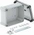 Kabelabzweigkasten mit Hutprofilschiene zum Verbinden von Kabeln und Leitungen im Innen- und Außenbereich. Rechteckige Form ohne Einführungen. Geeignet für die Wand-/ Deckenmontage mit der Möglichkeit zur Außenbefestigung, Innenbefestigung oder Montage über die Eckdome. Besonders schlagfest mit IK09. Transparenter Deckel mit Schnellverschluss, plombierbar. Hergestellt aus halogenfreien und UV-resistenten Materialien. Inklusive Hutprofilschiene 2069 und Befestigungsset. Kabelabzweigkasten gemäß DIN EN 60670. Schlagfestigkeit IK09 gemäß DIN EN 50102. Schutzart IP67 gemäß DIN EN 60529.
