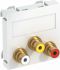 Multimediaträger mit drei Cinch-Anschlussbuchsen für Audio-Video, Kabelauslass gerade, mit Beschriftungsfeld, drei Cinch-Kupplungen (RCA) in Ausführung Buchse-Buchse, Farbkodierung gelb/rot/weiß. Trägerplatte mit Rastbefestigung, geeignet für den waagerechten und senkrechten Einbau in die Systemumgebung.