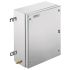 Gehäuse aus Metall für den Einsatz in explosionsgefährdeten Bereichen. Die Montagebohrungen befinden sich außerhalb des Dichtigkeitsbereichs. Eine Wandmontage kann durch Befestigungslöcher oder mit Montagefüßen realisiert werden.